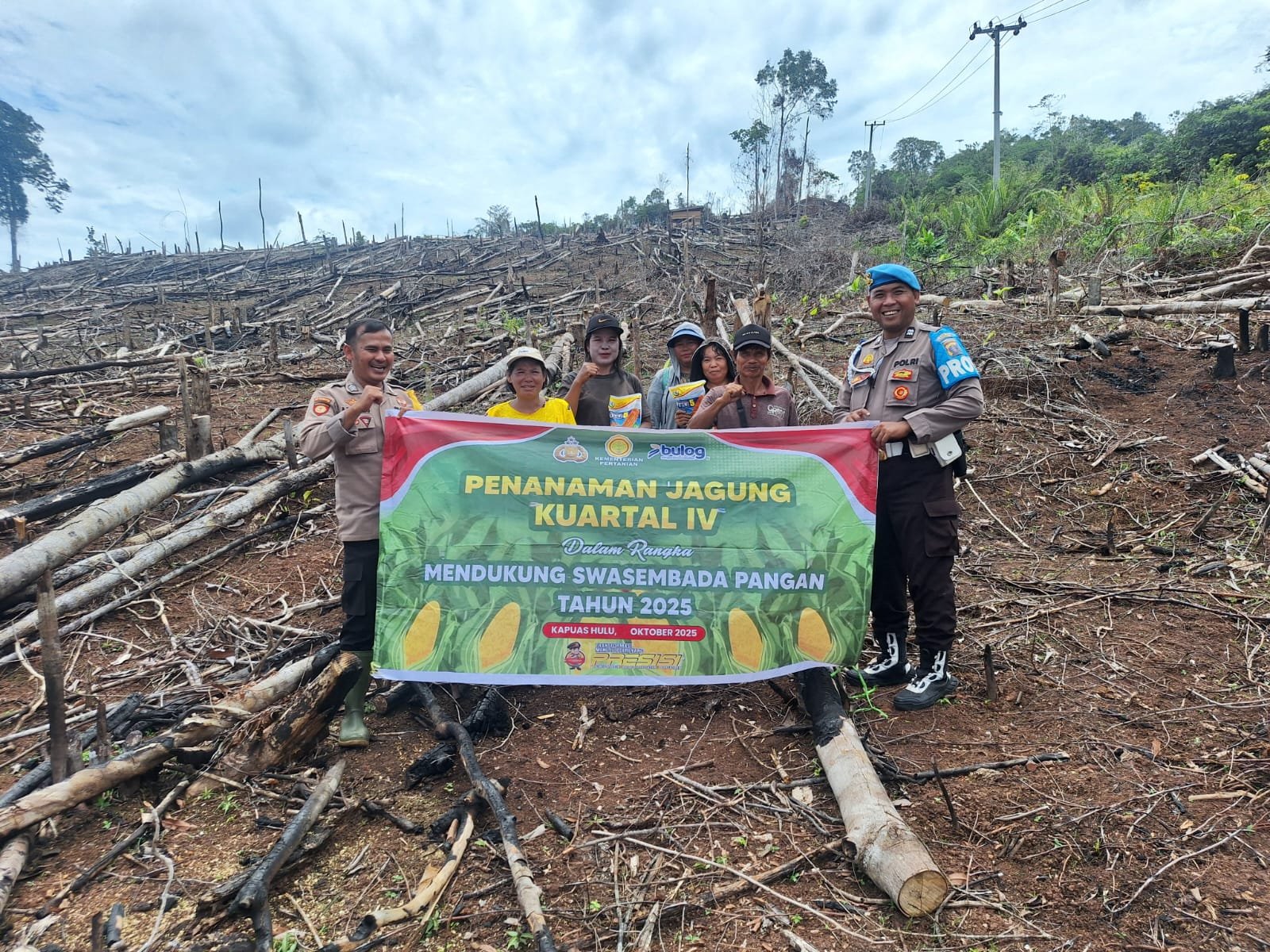 Tribratanews.kalteng.polri.go.id-Kapuas Hulu-Dalam rangka mendukung program ketahanan pangan nasional, Polsek Kapuas Hulu Polres Kapuas Polda Kalteng melaksanakan kegiatan penanaman jagung kuartal IV di lahan milik Sdr. Bungai Anuman beralamat di Desa Rahung Bungai RT. 002 Kec. Kapuas Hulu Kab. Kapuas Prov. Kalteng dengan koordinat: 0,9581S114,0266E, pada Sabtu (25/10/2025) mulai pukul 08.00 Wib s.d. selesai.