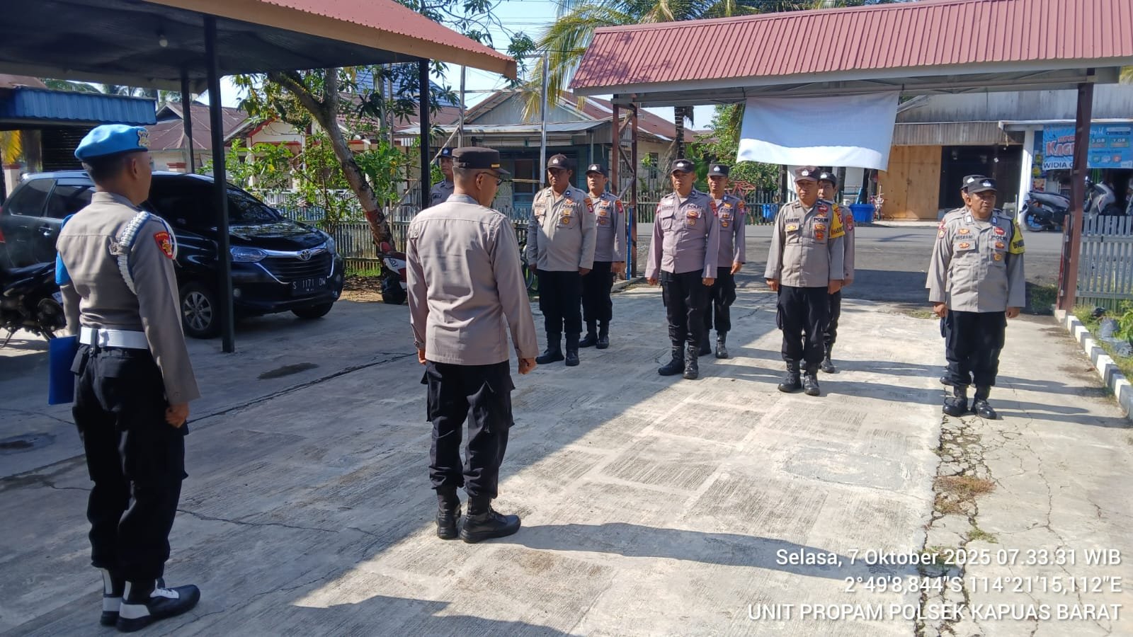 Kapuas Barat – Selasa pagi, 7 Oktober 2025, personel Polsek Kapuas Barat melaksanakan apel pagi rutin yang berlangsung di halaman Mako Polsek Kapuas Barat, Jalan Bhayangkara No. 55, Kelurahan Mandomai, Kecamatan Kapuas Barat, Kabupaten Kapuas, Kalimantan Tengah. Apel dimulai tepat pukul 07.30 WIB dan dipimpin langsung oleh Wakapolsek Kapuas Barat, IPDA Moh Sophii.