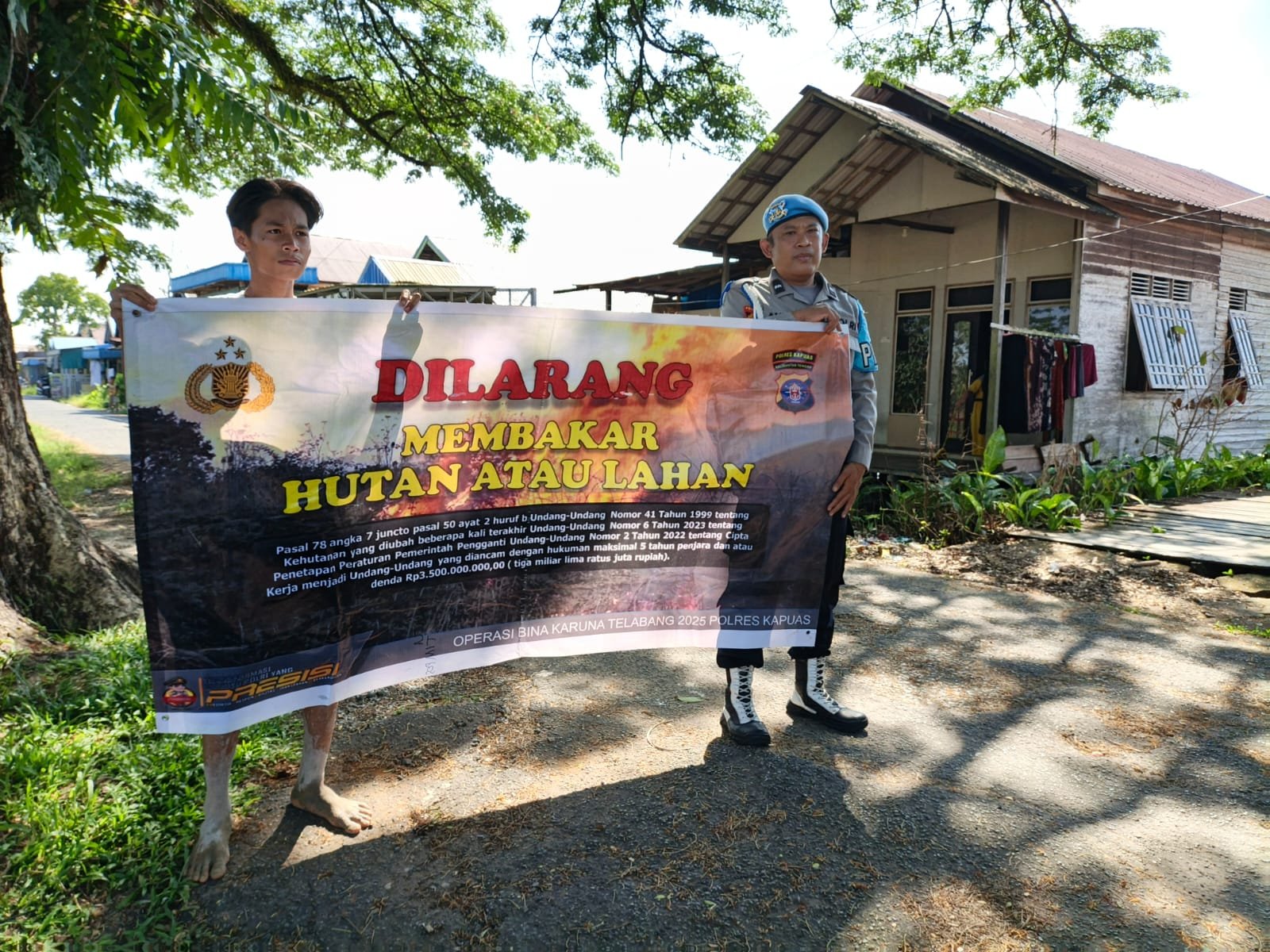 Bentang Sepanduk Larangan Membakar Hutan Dan Lahan Personil Polsek Kapuas Murung Melalui Giat Sosialisasi Karhutla