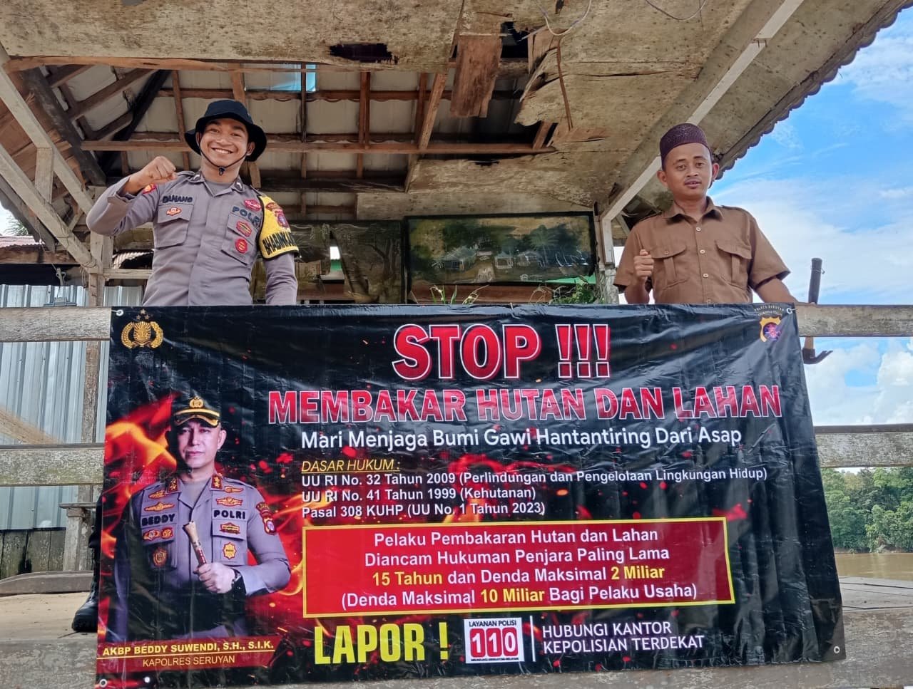 Polres Seruyan, 7 April 2026 – Bhabinkamtibmas Desa Ayawan, BRIPDA Akhmad Danang Pramudia, bersama staf pemerintah desa setempat melaksanakan pemasangan spanduk Karhutla (Kebakaran Hutan dan Lahan) sekaligus menyampaikan himbauan tentang larangan pembakaran hutan dan lahan di Dermaga Ferry Penyebrangan Desa Ayawan, Kecamatan Seruyan Tengah, Selasa (7/4/2026) pagi. Kegiatan yang berlangsung mulai pukul 08.00 WIB ini menyasar masyarakat Desa Ayawan.
