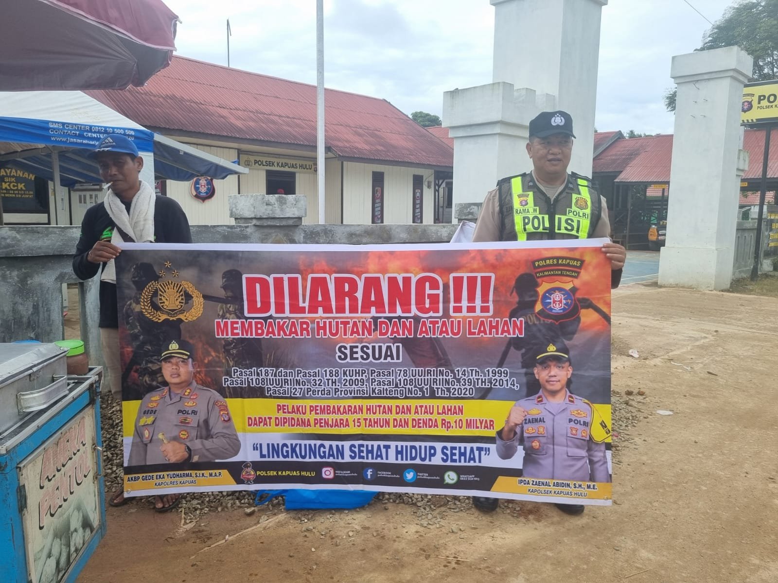 Tribratanews.kalteng.polri.go.id-Kapuas Hulu-Kegiatan sosialisasi dan imbauan larangan membakar hutan dan lahan dengan menggunakan spanduk yang berisi tentang sanksi dan pidana buka lahan dengan cara membakar, sesuai dengan pasal 187 dan pasal 188 KUHP, pasal 78 UU RI Nomor 41 Tahun 1999 tentang kehutanan, pasal 99 ayat (1), pasal 108, pasal 116, pasal 118, dan pasal 119 UU RI Nomor 32 Tahun 2009 tentang lingkungan hidup, pasal 108 UU RI Nomor 39 Tahun 2014 tentang perkebunan, pasal 27 Perda Prov. Kalteng Nomor 1 Tahun 2020 tentang pengendalian karhutla, pelaku pembakaran lahan dan hutan dapat di pidana penjara 15 Tahun dan denda 15 milyar rutin dilaksanakan oleh personel Polsek Kapuas Hulu Polres Kapuas jajaran Polda Kalteng Aiptu Rama Wijayadi dan Brigpol A. Pasaribu.