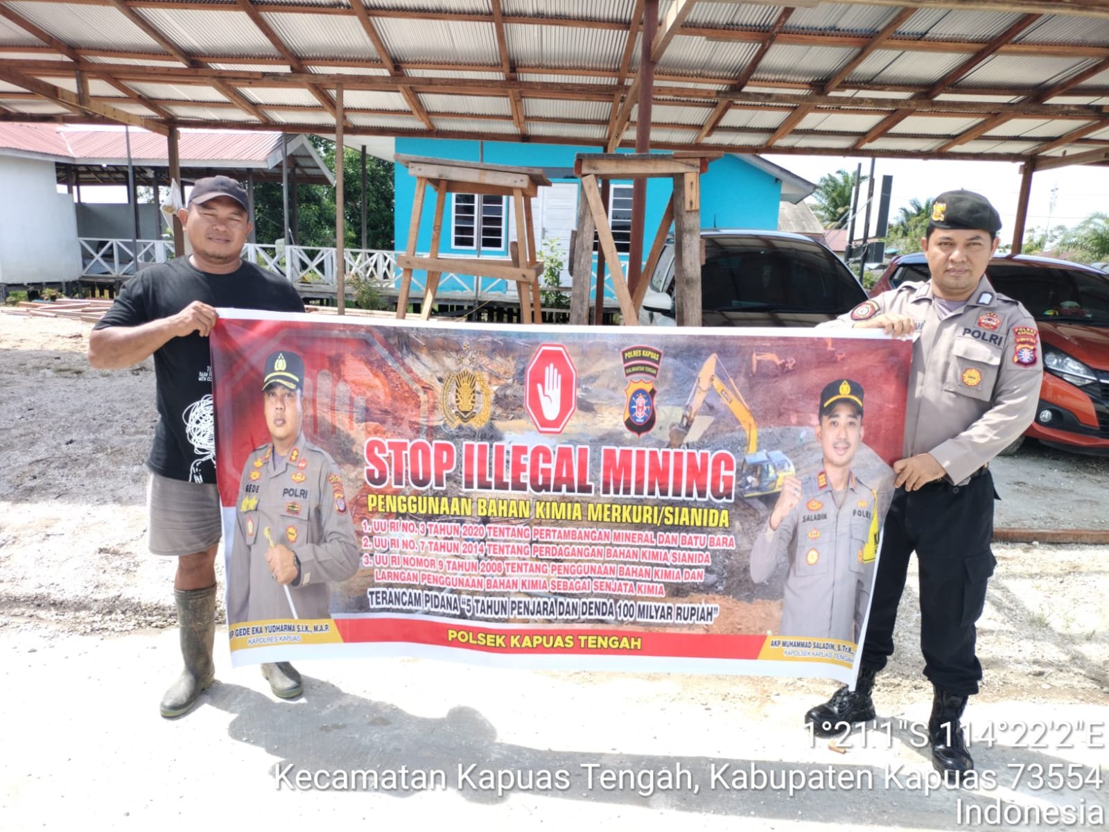 Polres Kapuas – Anggota Polsek Kapuas Tengah, Polres Kapuas, Polda Kalteng melaksanakan sosialisasi menggunakan sepanduk yang berbunyi Stop Penambangan Liar Dan Penggunaan Bahan Kimia Merkuri / Sianida, di Desa Pujon Kec. Kapuas Tengah Kab. Kapuas,Prov.Kalteng,Minggu,11/01/2026.