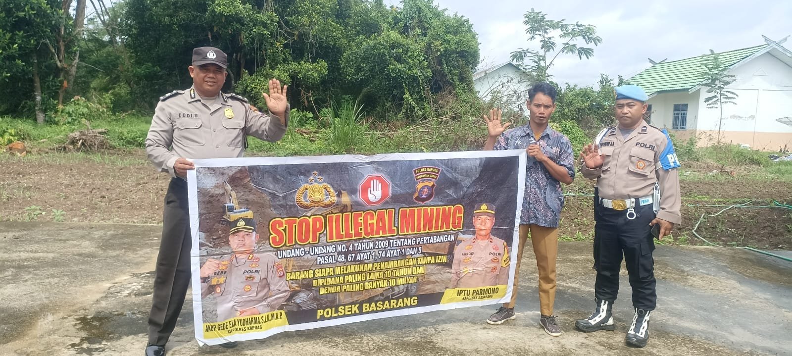 Polsek Basarang, Polres Kapuas jajaran Polda Kalteng – Cegah penambangan liar personil Polsek Basarang menggunakan spanduk sosialisasi stop Ilegal Mining kepada warga di Desa Tambun Raya Kecamatan Basarang Kabupaten Kapuas, Senin (9/3/2026).