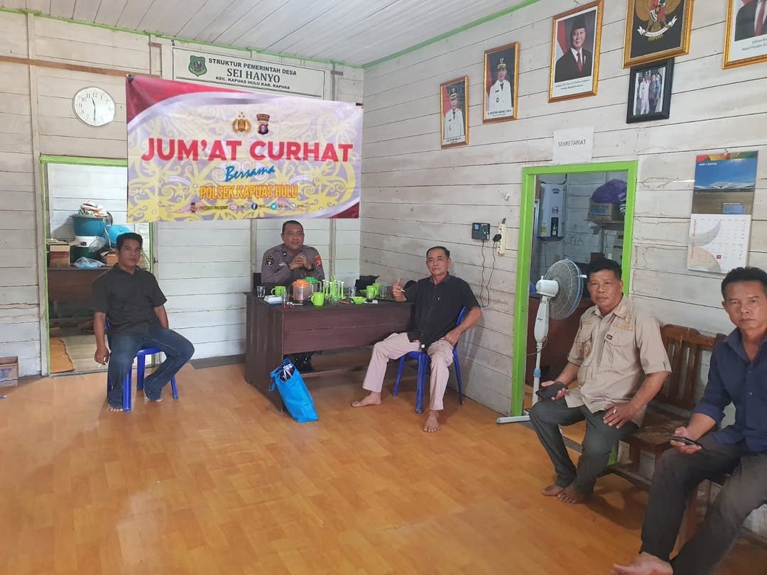 Tribratanews.kalteng.polri.go.id-Kapuas Hulu-Kapolres Kapuas Akbp Gede Eka Yudharma, S.I.K, M.A.P, melalui Kapolsek Kapuas Hulu Ipda Zaenal Abidin, S.H., M.E., dan Aipda Imanuel P. Nadeak bersama personel Polsek Kapuas Hulu melaksanakan kegiatan Jumat Curhat untuk bersama-sama mendengarkan keluh kesah maupun aspirasi warga diwilayah Kecamatan Kapuas Hulu melalui program Jumat Curhat di bersama waega masyarakat Desa Sei Hanyo Kecamatan Kapuas Hulu, Jumat (27/02/2026) pukul 09.30 Wib.