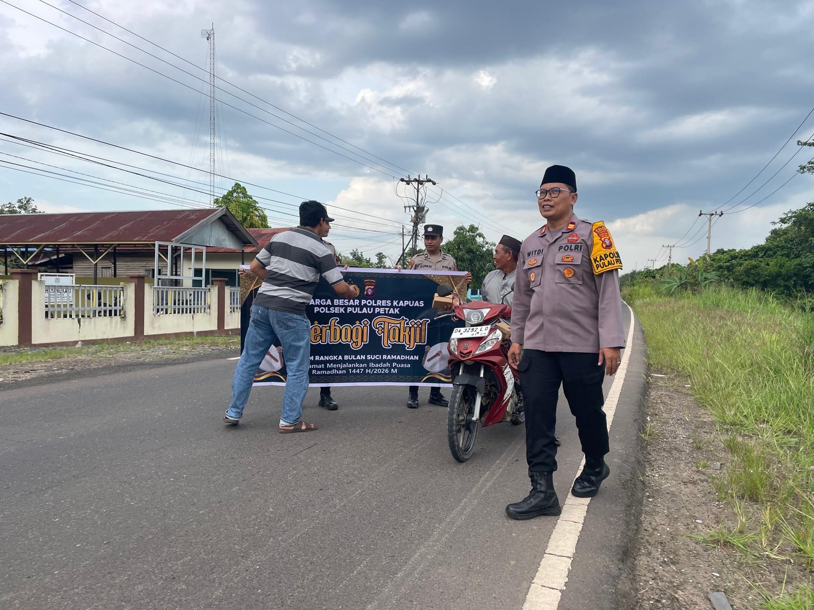 Pembagian takjil di pimpin langsung Kapolsek Pulau Petak Iptu Witdiardi. S.E. dan diikuti oleh sejumlah personel kepolisian untuk membagikan takjil kepada warga masyarakat yang sedang melintas di depan mako polsek pulau petak JL Pemuda Km,16,5 Desa Sei Tatas Hilir Kecamatan Pulau Petak,”