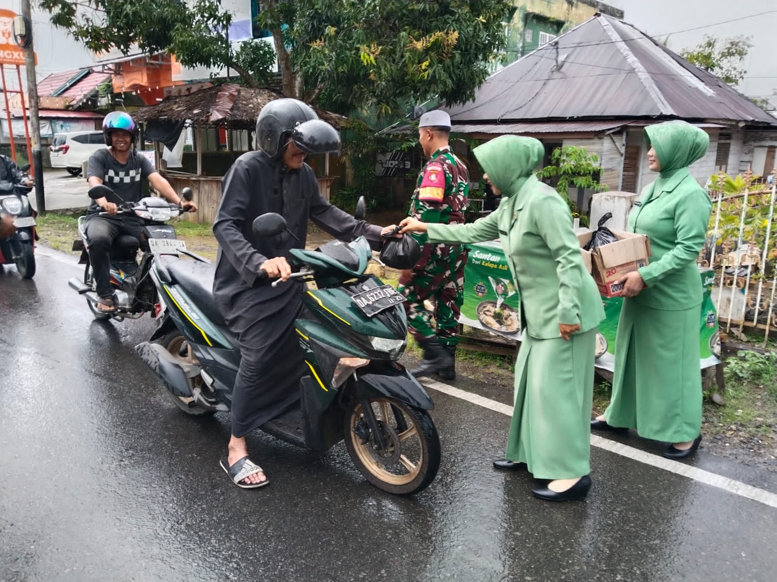 BARABAI – Indahnya berbagi di bulan suci Ramadhan, Koramil 1002-06/Barabai bersama Persit Kartika Chandra Kirana Ranting 7 Barabai melaksanakan kegiatan pembagian takjil kepada warga yang melintas di Jalan Antasari, tepatnya di depan Makoramil 1002-06/Barabai, Senin (09/03/2026).
