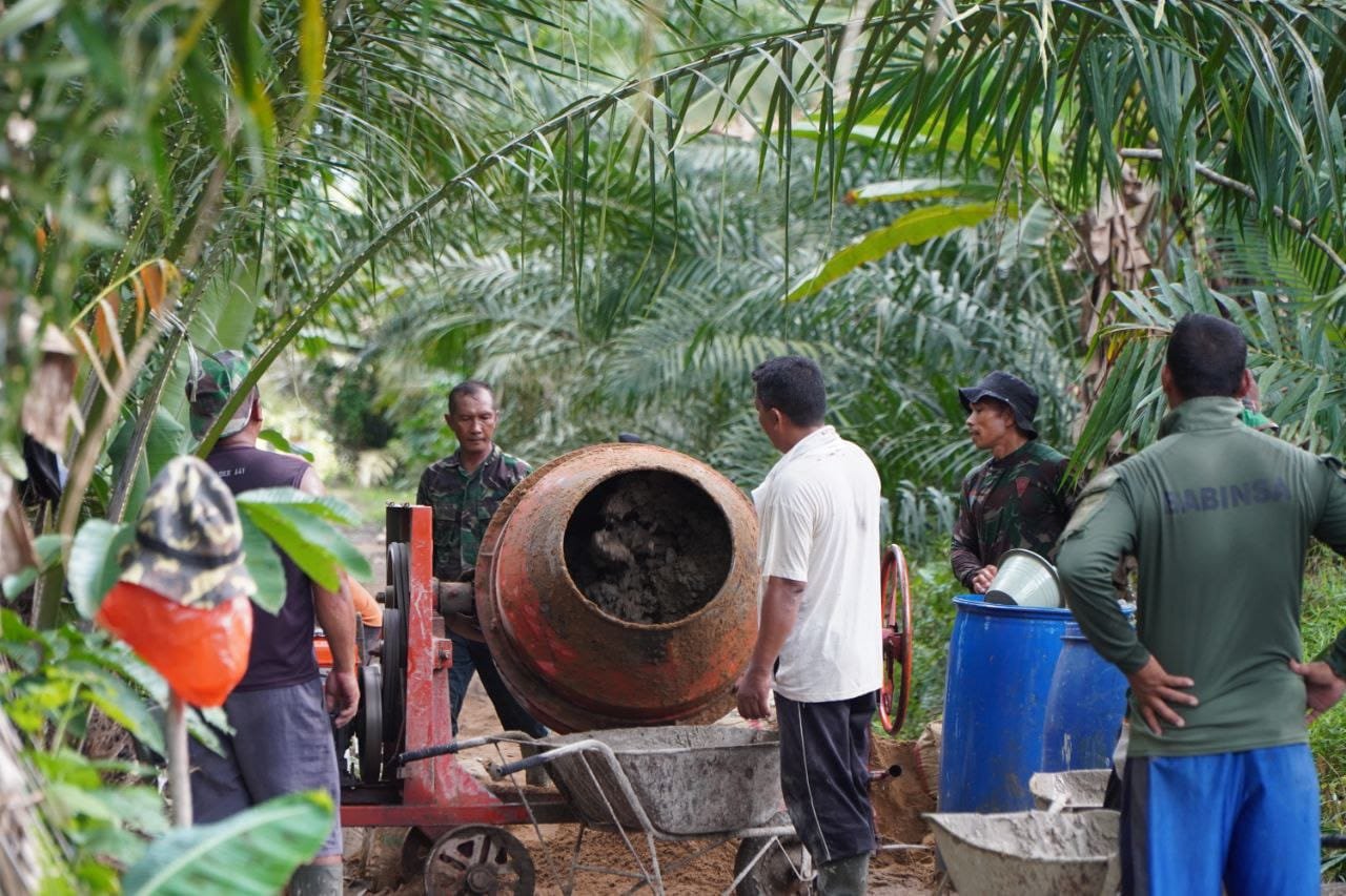 Di tengah cuaca panas yang menyengat, mesin molen terus berputar menandakan aktivitas pengecoran masih berjalan. Satgas TMMD bersama warga tampak kompak bergotong royong mencampur material untuk pembuatan rabat beton jalan desa.