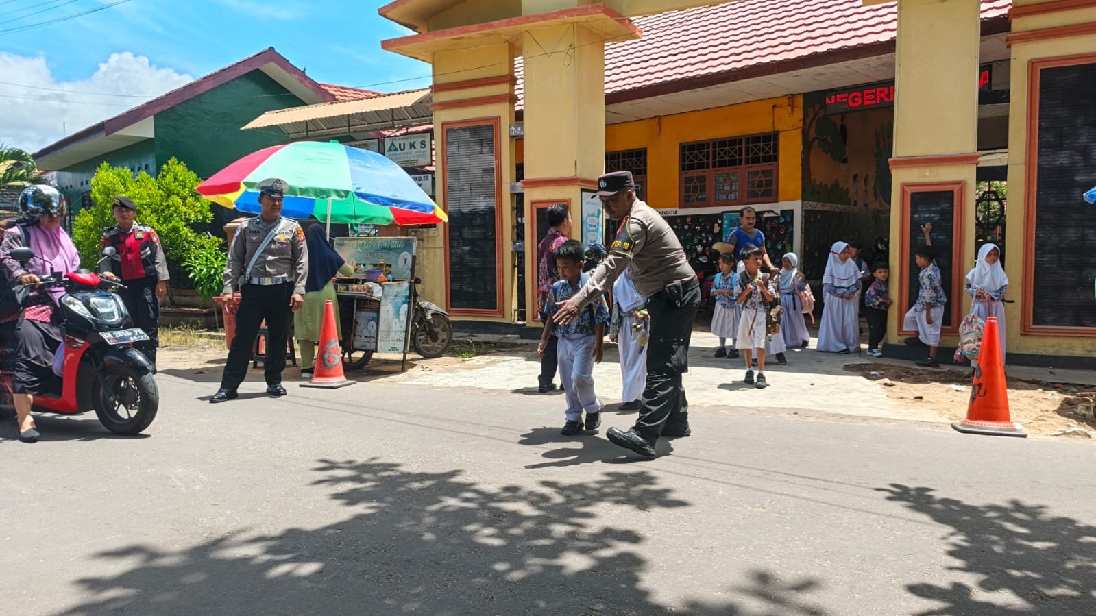 Personel Pamapta III Polres Seruyan melaksanakan kegiatan strong point siang berupa pengaturan lalu lintas dan membantu penyeberangan siswa saat jam pulang sekolah, Kamis (9/4/2026) sekitar pukul 11.00 WIB hingga selesai.