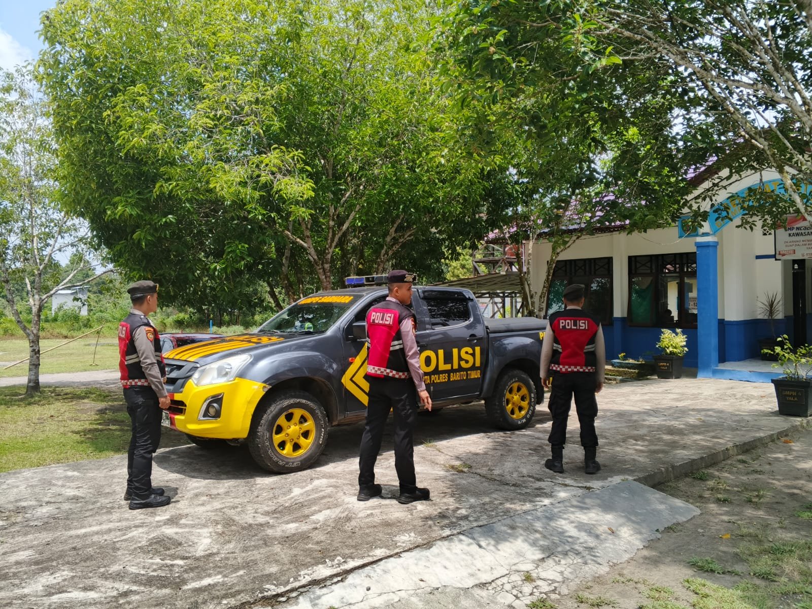 Kegiatan patroli menggunakan **satu unit kendaraan dinas R4 Isuzu D’Max** dengan nomor polisi 1032-35 yang diawaki oleh personel Satsamapta yaitu **Bripda S.D. Riano P.A, Bripda Janni V, dan Bripda Kevin Eka P**.