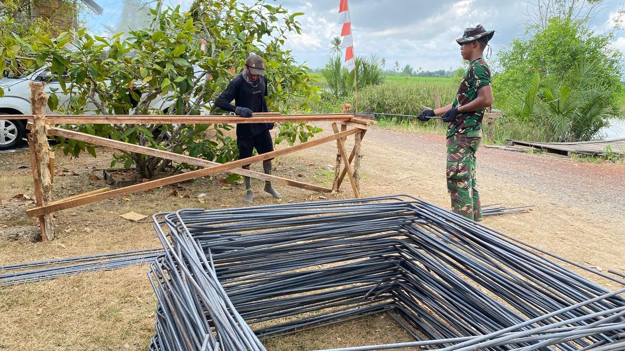Tanah Laut – Pembangunan Jembatan Garuda di Desa Handil Labuan Amas, Kecamatan Bumi Makmur, terus berlanjut dengan progres yang semakin terlihat nyata. Sembari menyelesaikan penggalian lubang pondasi di tengah kondisi medan yang sulit, hari ini Rabu (15/04/2026), sebagian personel Kodim 1009/Tanah Laut memasuki salah satu tahapan penting, yakni menyiapkan rangkaian besi cakar ayam sebagai struktur utama pondasi jembatan.