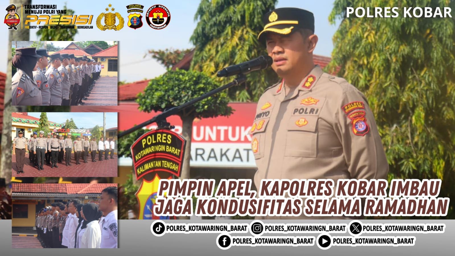 Kapolres Kobar AKBP Theodorus Priyo Santosa, S.I.K., saat memimpin apel pagi pada Senin (9/3/2026) mengatakan, sebagai upaya menjaga situasi kamtibmas tetap aman, kondusif, dan terkendali selama Ramadhan dirinya mengimbau agar setiap personelnya senantiasa meningkatkan kewaspadaan.