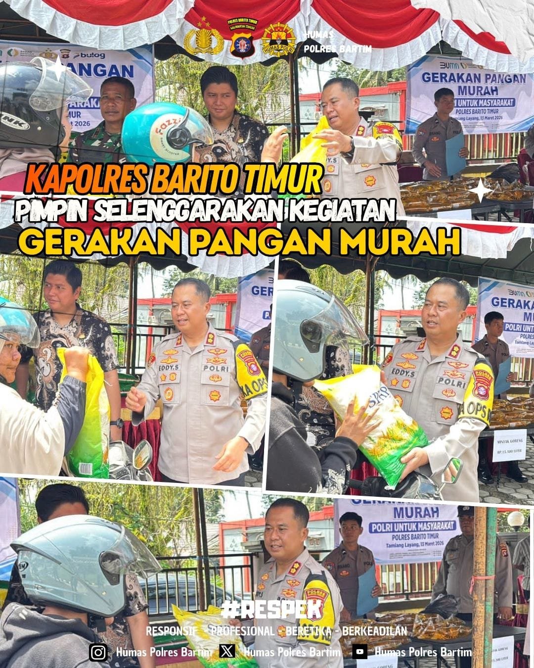 Kapolres Barito Timur **AKBP Eddy Santoso, S.I.K., M.H.** melalui Kasat Binmas Polres Bartim **AKP Asep Supriadi** menyampaikan bahwa kegiatan Gerakan Pangan Murah ini merupakan bentuk kepedulian Polri bersama pemerintah dalam menjaga stabilitas harga bahan pokok di tengah masyarakat.