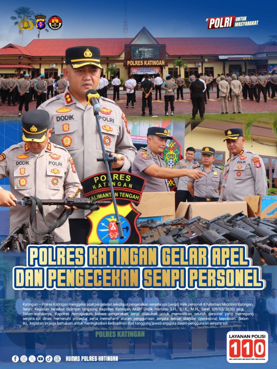 Katingan – Polres Katingan menggelar apel pergelaran sekaligus pengecekan senjata api (senpi) milik personel di halaman Mapolres Katingan, Senin. Kegiatan tersebut dipimpin langsung Kapolres Katingan AKBP Dodik Hartono S.H., S.I.K., M.H., Senin (09/03/2026) Pagi