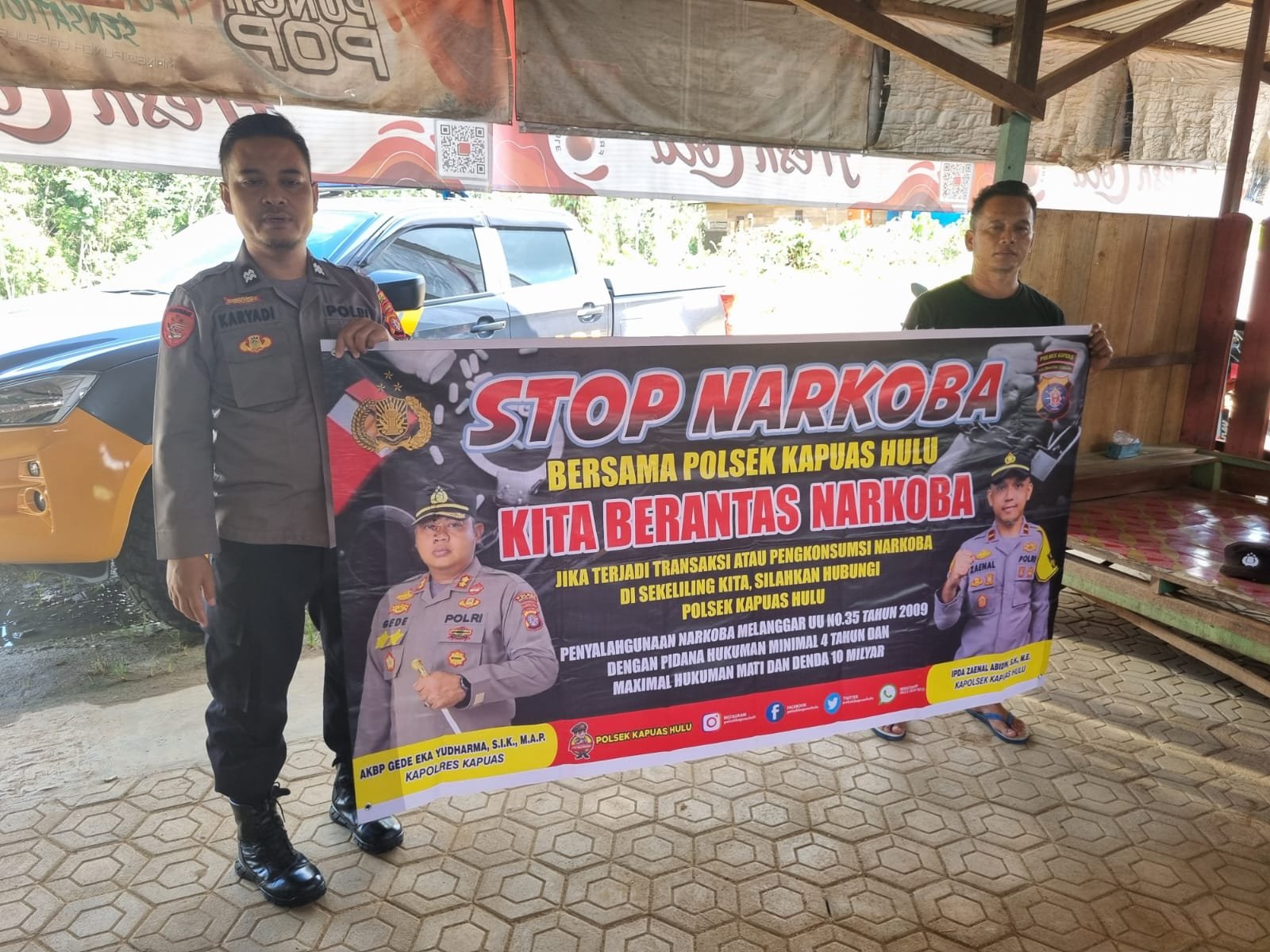 Tribratanews.kalteng.polri.go.id-Kapuas Hulu-Dalam upaya meningkatkan pencegahan dan penanggulangan penyalahgunaan narkoba, Polsek Kapuas Hulu telah melaksanakan imbauan melalui media spanduk bertuliskan “Stop Narkoba” di beberapa lokasi yang dianggap rawan tindak pidana narkoba yang dilaksanakan oleh Aiptu Rama Wijayadi dan Aiptu Karyadi Bertempat di Desa Sei Hanyo RT. 002 Kecamatan Kapuas Hulu Kapuas Hulu Kabupaten Kapuas Provinsi Kalimantan Tengah, Senin (21/07/2025) pukul 09.50 WIB