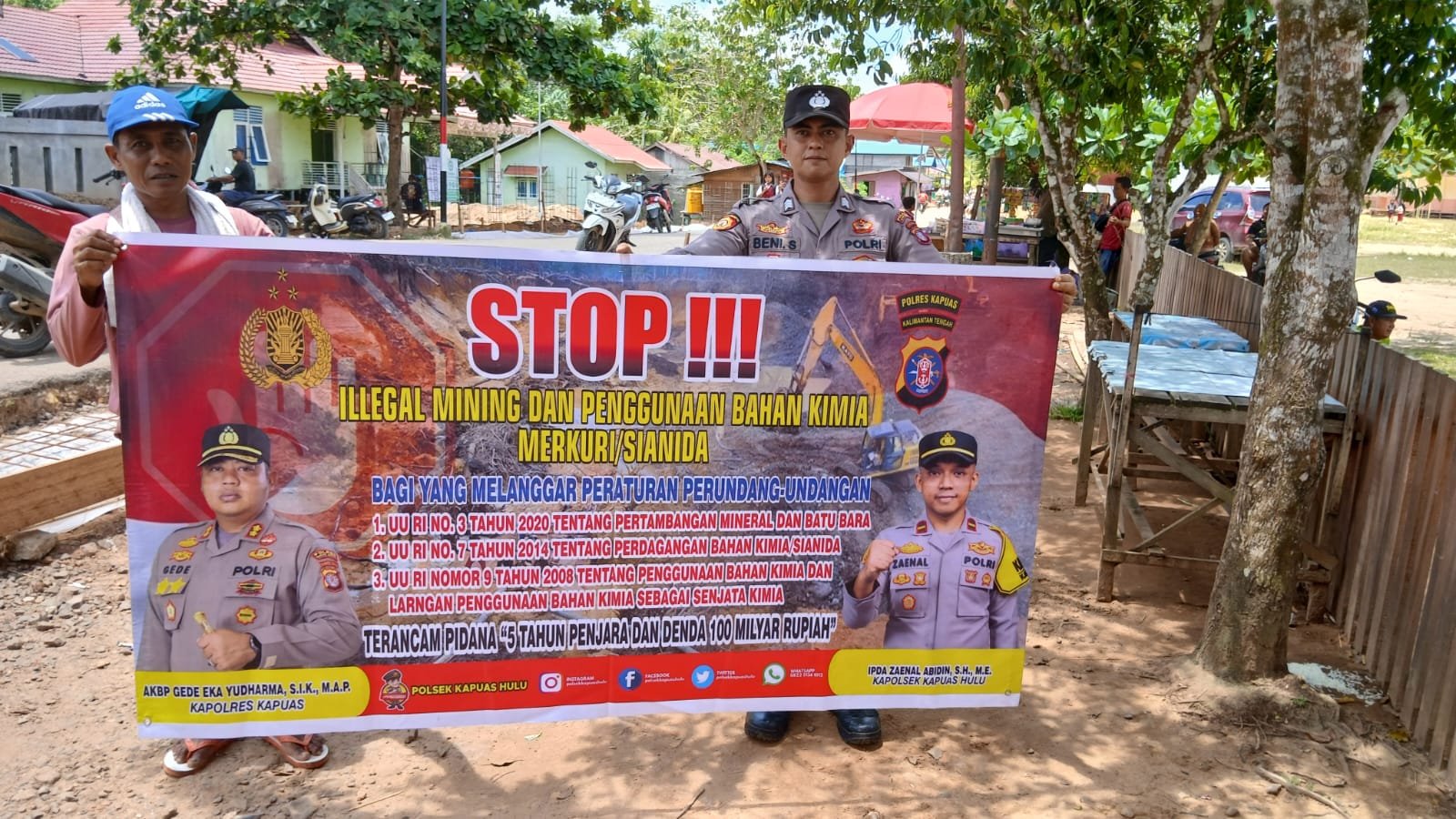 Stop iIlegal mining serta sanksi pidana ada terkandung dalam undang-undang RI nomor 3 tahun 2020 tentang pertambangan mineral dan batubara, undang-undang RI nomor 7 tahun 2014 tentang perdagangan bahan kimia/sianida, dan undang-undang RI nomor 9 tahun 2008 tentang penggunaan bahan kimia sebagai senjata kimia terancam pidana penjara selama 5 tahun dan denda 100 milyar rupiah dan berikan imbauan bersama-sama dalam menanggulangi iIlegal mining