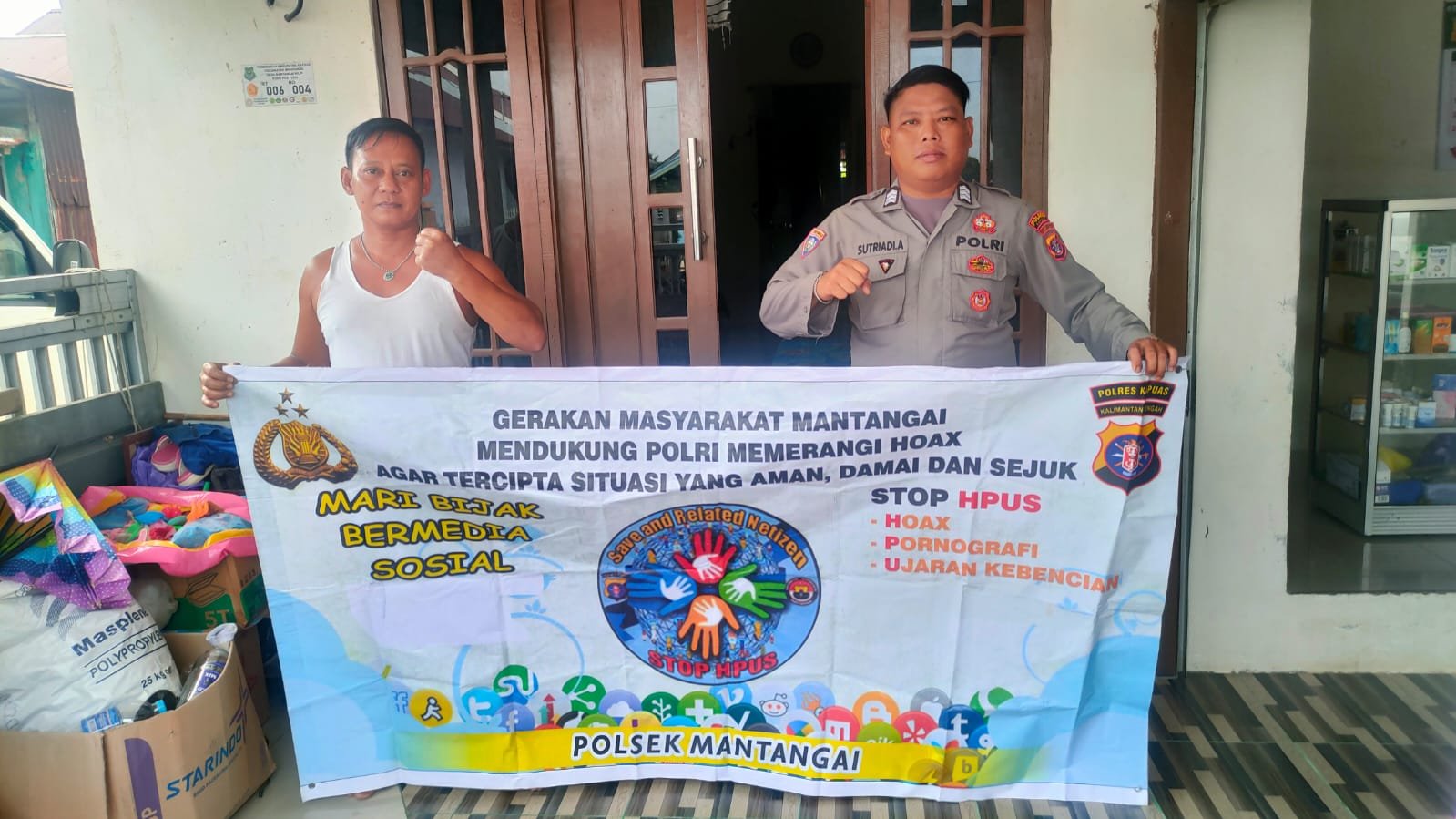 Kapolsek Mantangai Ipda Jonika, S.Sos. menyampaikan, anggotanya rutin mensosialisasikan program pemerintah tentang Anti HPUS (Hoax, Pornografi, Ujaran Kebencian dan Sara) kepada warga dengan menggunakan media spanduk imbauan.