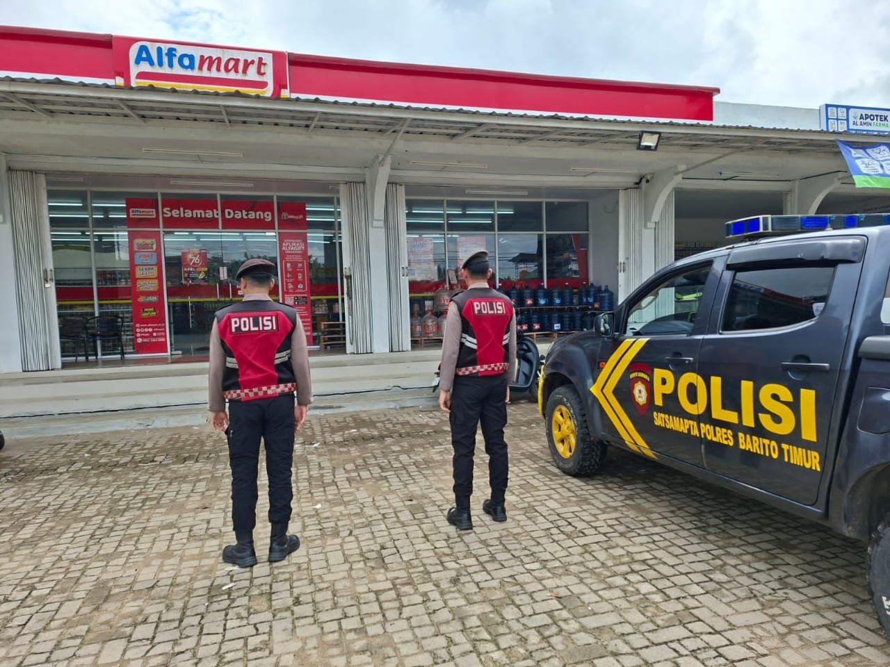 Personel Satsamapta Polres Barito Timur melakukan pemantauan situasi di sekitar Alfamart, termasuk area parkir kendaraan dan pintu masuk toko, guna memastikan kondisi tetap aman dan kondusif.