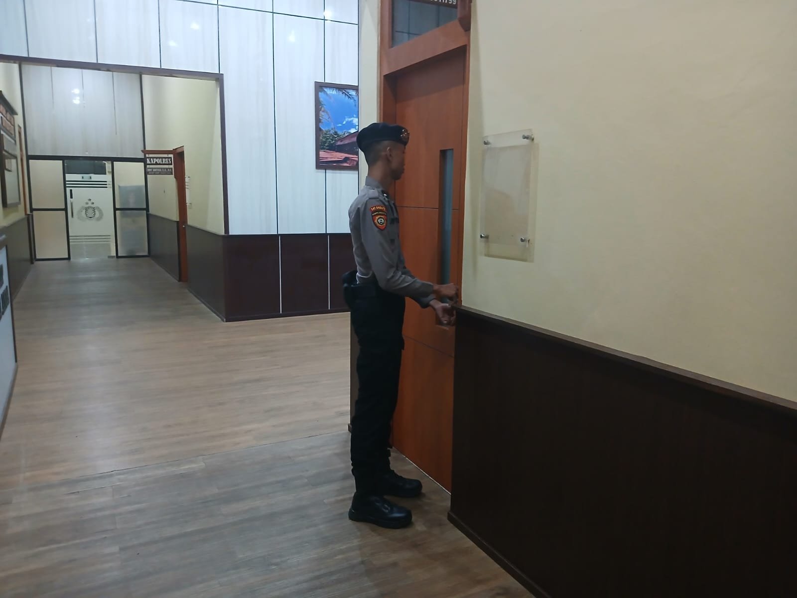 Patroli ini dipimpin oleh Bripka Vrydha Respathy Q, dengan didampingi oleh Bripda I Made Arya W dan Bripda Mikhael A. Mereka melakukan pemeriksaan dan observasi di sekitar Pintu Kantor Kapolres untuk memastikan situasi aman dan kondusif.