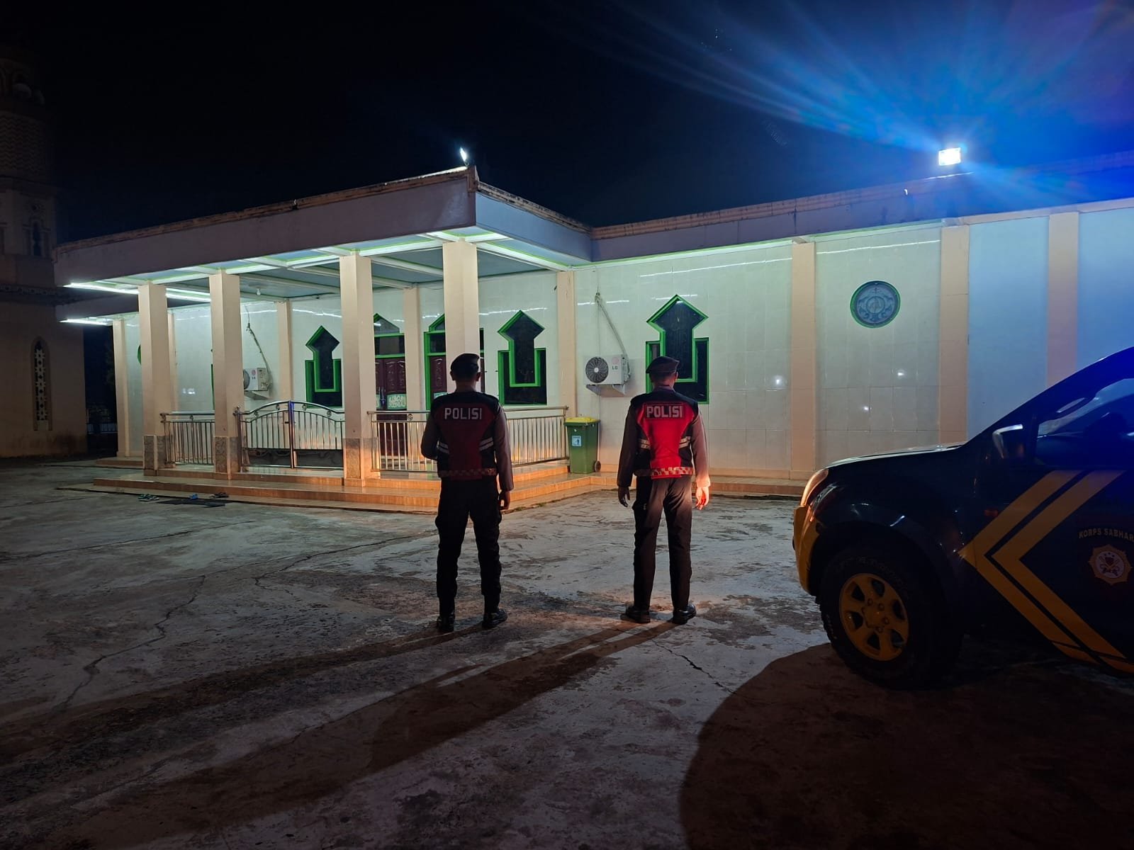Petugas melakukan observasi secara menyeluruh di sekitar area masjid guna mengantisipasi adanya potensi gangguan keamanan.